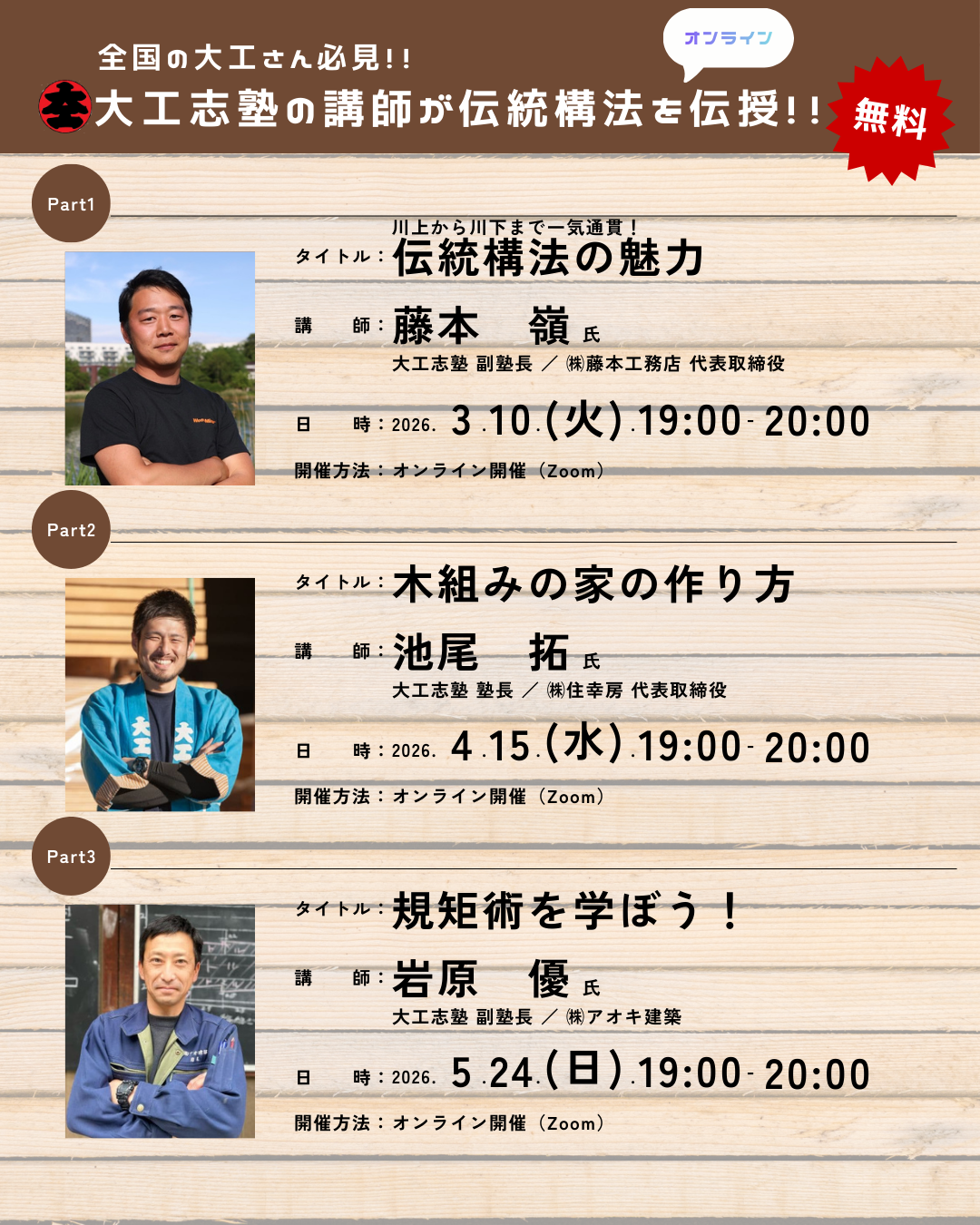 大工志塾では、大工職人が働きながら、木造伝統構法に用いられる墨付け刻みの基本的な大工技術・技能を習得できます。「入塾してみたいがどんなことが学べるか分からない」「興味はあるけれど一歩が踏み出せない」という全国の大工さんに向けて、無料のオンライン体験講義を開催します。工務店に就業されている大工さん、一人親方の大工さんに限らず、大工志塾に興味のある皆さまのご参加をお待ちしております。